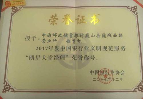 近日,在2017年中國銀行業“明星大堂經理”評選活動中,大理州巍山縣分公司趙秀松同志以出色的表現榮獲中國銀行業文明規范服務“明星大堂經理”稱號。