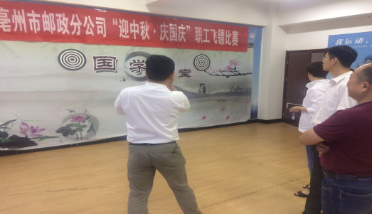 為喜迎中秋、國慶佳節,活躍豐富職工精神文化生活,增強企業凝聚力和向心力,9.17日至21日,亳州市郵政分公司工會在十樓工會舉辦了“迎中秋、慶國慶”職工飛鏢比賽,活動吸引廣大職工的熱情參與。 亳州市郵政工會立足于為員工辦實事,辦好事,豐富職工業余生活,讓員工滿意為總之,積極組織開展形式多樣的文體活動,使企業凝聚力大大增強。為辦好這次“迎中秋·慶國慶”飛鏢比賽,工會提前謀劃,提前布置,結合中秋、國慶特殊氛圍,購置了月餅、石榴等節日佳品。在避免和以前活動雷同的同時,盡量推陳出新。為照顧全面,全員參與,亳州郵政工會把活動時間專門調整到每天晚上17:30以后進行,擴大了參與面,促進了企業凝聚力的推進。
