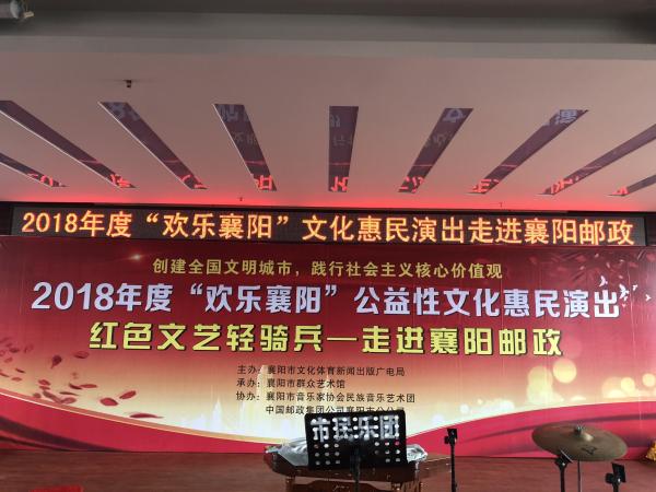 為持續推進幸福郵政建設,豐富郵政員工業余文化生活,營造輕松活潑、激情奮進的工作氛圍,在中秋佳節和十一國慶節來臨之際,襄陽市分公司、市郵政工會聯合襄陽市音樂家協會民族音樂藝術團共同舉辦《2018年度“歡樂襄陽”文化惠民演出走進襄陽郵政》民族音樂會,通過一場高雅藝術盛會向全市郵政員工致以最誠摯的節日祝福。