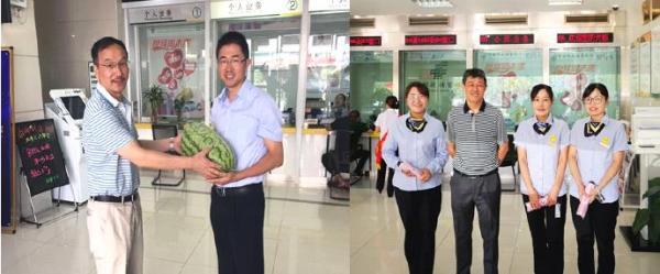 炎炎夏日送清涼,黃山市分行為全行員工統一配發了綠豆、冰糖、藿香正氣丸、風油精、驅蚊花露水和其他日化等防暑降溫用品,各區縣支行也分別開展“夏送清涼”慰問活動。近日上午,市分行行長劉宏平和副行長葉文虎分別攜帶西瓜和防曬傘前往所屬支行開展“送清涼”慰問。每到一處,劉宏平行長和葉文虎副行長把大西瓜送到支行辦公室,將防曬傘一一發給客戶經理,并詢問大家工作和身體情況,叮囑大家要注意勞逸結合,提醒客戶經理外出走訪要做好防暑和人身安全防護工作,保持手機聯系暢通。同時,要求支行加強消防設施的日常檢查和維護工作,既要確保安全度過高溫季節,又要確保經營服務工作不滑坡,為完成全年工作目標打下良好基礎。