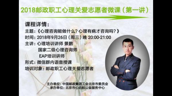 根據2018年北京郵政職工心理關愛活動安排,北京市郵政分公司建立了一支擁有200余名職工的北京郵政心理關愛志愿者隊伍,并專門建立了“北京郵政心理關愛志愿者(微課群)”。為提高志愿者的心理專業知識和解決心理問題的能力,北京郵政工會與心啟航公司合作,將在2018年9月至2019年4月期間為心理關愛志愿者精心準備6次微課。9月26日是第一講,北京郵政工會要求各基層單位的志愿者做好聽課前的準備工作,力爭帶著問題去聆聽、去學習、去理解,以達到良好的實際效果。(北京郵政工會)