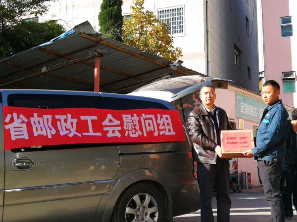 11月6日—11月12日,省分公司資深經(jīng)理、省郵政工會副主席陳智率省郵政工會同志赴貴陽、畢節(jié)、遵義市分公司、寄遞事業(yè)部慰問基層一線員工,看望慰問戰(zhàn)斗在旺季生產(chǎn)經(jīng)營一線的支局所、投遞部的員工,給職工們送上了米、油、罐頭等慰問品,送上省分公司黨組、省郵政工會的關心和問候,為基層一線“戰(zhàn)旺季”加油鼓勁。每到一個支局所,陳副主席都會參觀職工小家,與一線員工交談,了解支局業(yè)務發(fā)展情況、周邊市場競爭情況、員工收入情況,感謝大家對旺季生產(chǎn)付出的努力,并鼓勵大家繼續(xù)奮勇爭先,打好旺季攻堅戰(zhàn),努力實現(xiàn)“三個確保”。在職工小家,陳副主席指出,我們的職工小家就是要為基層員工打造優(yōu)質(zhì)、溫馨的工作環(huán)境和生活環(huán)境,為基層員工解決吃、住等方面的后顧之憂,工會要在旺季生產(chǎn)經(jīng)營中發(fā)揮娘家人作用,關心關愛基層員工,加強職工小家建設,增強員工歸屬感,為旺季生產(chǎn)經(jīng)營貢獻力量。