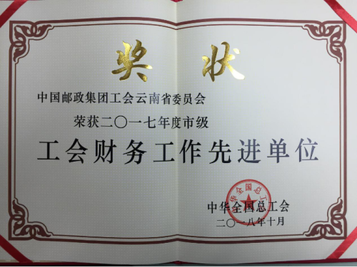 云南省郵政工會財務工作在省總工會的指導和省郵政工會的領導和支持下,緊密圍繞工會工作全局,堅持工會財務工作創新,切實加強工會經費管理,全面實施財務會計管理規范化建設,努力提升財務管理水平,在經費收繳、預算管理、建章立制、支持和保證工會重點工作資金需求等方面取得了顯著成效。榮獲了中華全國總工會授予的“2017年度市級工會財務先進單位”稱號,全省僅有9個市級工會獲此殊榮。