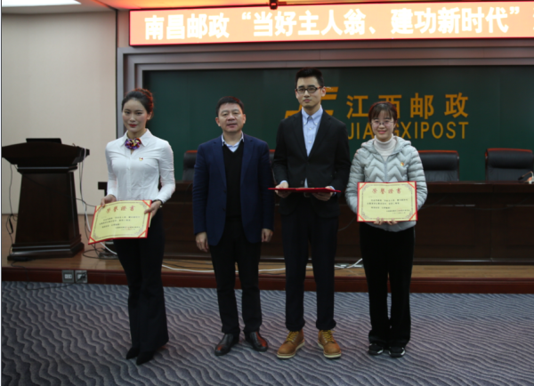 南昌市分公司黨委書記、總經理呂茂華,市分公司調研員、副總經理金曉強,市分公司副總經理、工會主席雷武高分別為獲獎選手頒獎。(江西省郵政工會)