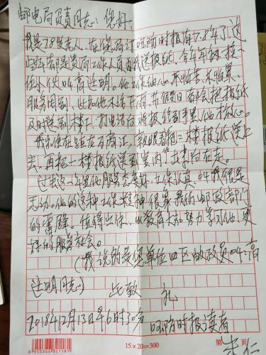 信中寫到老同志朱仁在郵政訂閱報刊已有七、八年,是《國防時報》的讀者,也是郵政忠實的老客戶。投遞員高廷明負(fù)責(zé)該老人所住片區(qū)的投遞服務(wù)工作,無論刮風(fēng)下雨、風(fēng)吹日曬、或是節(jié)假日,都能看到投遞員高廷明忙碌的身影。信中說到:投遞員每次投遞時都能親自把報刊交到老人手上,投遞員認(rèn)真負(fù)責(zé)的工作態(tài)度是我們郵政企業(yè)的雷鋒精神。老人家提出要我們學(xué)習(xí)他的精神,更好的服務(wù)社會。高廷明同志用實際行動詮釋了“人民郵政為人民”的服務(wù)宗旨,用實際行動踐行著郵政人的職責(zé)與使命。