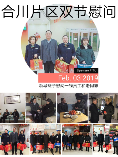為發揚中國郵政的傳統美德,次日片區分公司黨委書記王總又赴潼南、銅梁看望慰問退休老領導,王總握住老領導的手深情的感謝老領導們曾對郵政事業做出的巨大貢獻,向老領導們致以誠摯的節日問候,衷心祝愿老領導們新春愉快、健康長壽。也希望老領導們能一如既往的支持郵政事業的發展,為合川郵政事業的發展建言獻策;郵政企業員工定當以老一輩為榜樣,努力奮斗,開拓創新,為把合川郵政做優做強做大而不懈努力。