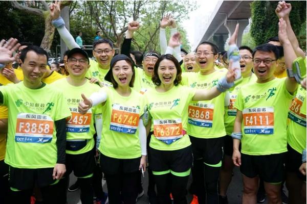 4月14日上午7時30分,2019武漢馬拉松鳴槍開跑,來自世界各地的2.4萬名參賽選手中,身著熒光綠比賽服的湖北郵政跑團格外靚麗耀眼。