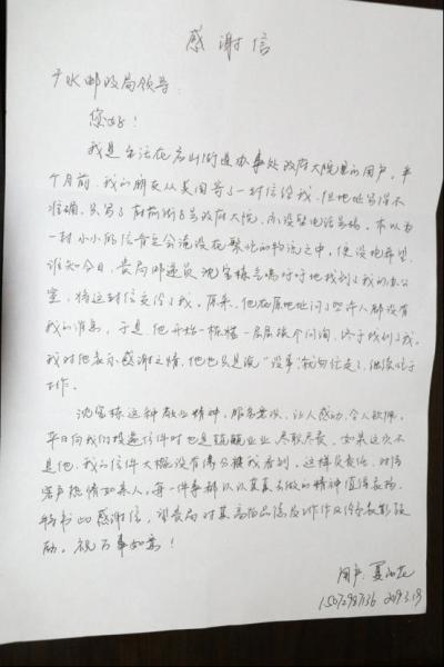 “本以為一封小小的信件肯定會被淹沒在繁忙的物流之中,誰知今日,貴局郵遞員沈寶棟氣喘吁吁的找到了我的辦公室,將這封信交給了我。如果這次不是他,我的信件大概沒有緣分被我看到?!?月19日,一封手寫在白紙上的感謝信被送到廣水市郵政分公司總經理辦公室。感謝信出自廣水市委宣傳部新聞科工作人員夏雨花,洋洋灑灑三百余字,感激之情流淌在字里行間。