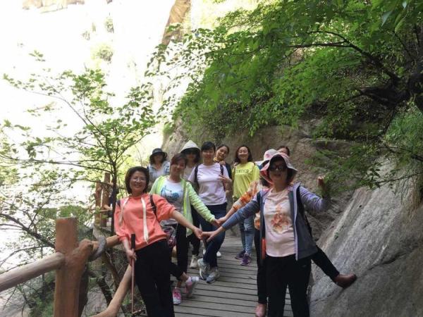 開始爬山啦,大家個個精神抖擻、意氣風(fēng)發(fā),朝著山頂奮力前進。山間峪道窄狹清幽,山路崎嶇蜿蜒,河流湍急,山石險峻,多處路段鑿崖,加棧凌空通過。盡管有個別伙伴由于身體原因使登山的腳步慢了下來,但他們互相鼓勵,相相互攙扶,處處體現(xiàn)著團結(jié)的力量 。