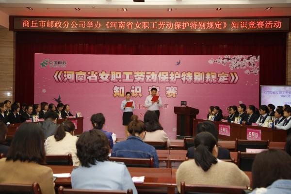 為進(jìn)一步推動(dòng)保障女職工權(quán)益法律法規(guī)的學(xué)習(xí)和普及,促進(jìn)保護(hù)女職工權(quán)益法律法規(guī)的貫徹落實(shí),商丘市郵政分公司于近日舉辦了商丘市郵政系統(tǒng)《河南省女職工勞動(dòng)保護(hù)特別規(guī)定》知識競賽。來自各縣(市、區(qū))分公司、市分公司和寄遞事業(yè)部共11個(gè)代表隊(duì)參加了本次競賽活動(dòng)。