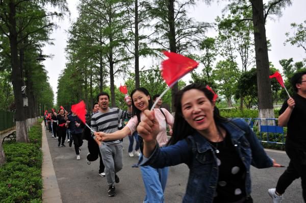 參觀學習結束后,在四面鮮紅旗幟的帶領下,大家集體前往東湖綠道開展了“健步走”活動。活動中,大家分為兩隊,有序前行。6公里的行進路程,大家時而口號聲聲、時而紅歌嘹亮、時而小憩留影、時而瘋狂暴走,在湖邊綠道上形成了一道靚麗的風景線,引得路人頻頻觀望、駐足拍照,湖北郵政青年員工朝氣蓬勃、積極向上的青春風貌一展無遺。