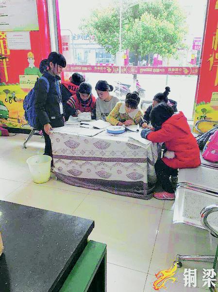 “周一到周四,這里的學生有20個左右,只有周五部分學生要乘車回銅梁,部分學生走路回家,這里學生就少很多。”劉文萍說,營業廳里原本沒有桌子,板凳也是提供給前來辦業務的顧客坐的。為何會在這兒設立一個“四點半”課堂,這源于一年前她的一個發現。