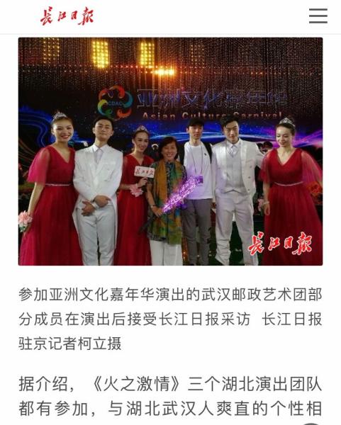 郵政藝術團的優(yōu)秀表現(xiàn)受到了省內各大媒體的關注和爭相報道。團長龔焰在接受《長江日報》記者采訪時說:“《火之激情》節(jié)目因需要與外國藝術家同臺,音樂合成難度很大。有些國外藝術團隊前期排練的音樂與嘉年華演出的音樂有差別,必須重新錄音合成,這個節(jié)目與多個外國演出團隊合作,每來一個國家我們都要重新合成一次音樂,工作量是加倍的,對演員來說很具有挑戰(zhàn)性。”