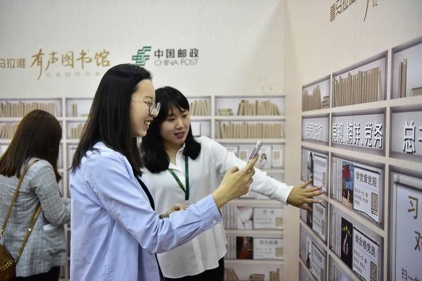 圖為在“郵文化”活動現(xiàn)場的有聲圖說展區(qū),客戶現(xiàn)場掃碼收聽《習(xí)總書記對你說》