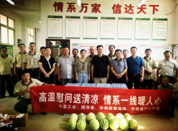 8月2日上午,咸寧市總工會張恩和副主席、團市委李雪梅副書記、市郵政管理局楊正合局長、市快遞行業協會等領導一行,在市分公司辛紅輝副總經理、工會負責人的陪同下,深入岔路口投遞站、網路運行中心開展“關愛快遞小哥 夏日送清涼”慰問活動,為戰斗在高溫一線的投遞員、駕押員、分揀員送上礦泉水、西瓜。