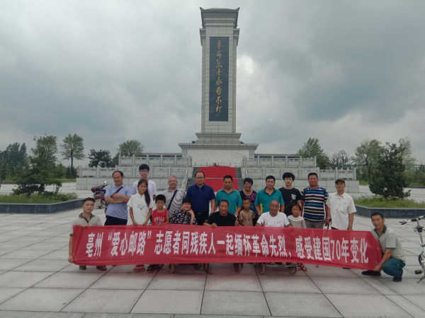 8月11日是第十個全國肢殘人活動日,當日上午,安徽亳州市郵政分公司“愛心郵路”七位志愿者志愿者,駕駛著自己的車輛,帶領(lǐng)“愛心郵路”上的困難殘疾人,到亳州皖北烈士陵園,一起瞻仰革命烈士紀念碑,緬懷革命先烈,回憶革命艱苦歲月,共同感受建國70年變化。 為做好此項活動,讓殘疾人感受偉大祖國七十年來的變化,亳州市郵政工會精心組織,提前對接,專程驅(qū)車到偏遠鄉(xiāng)鎮(zhèn),去接那些平時因行動受限,不能出行的困難殘疾人,與他們一起感受偉大祖國日新月異的變化。