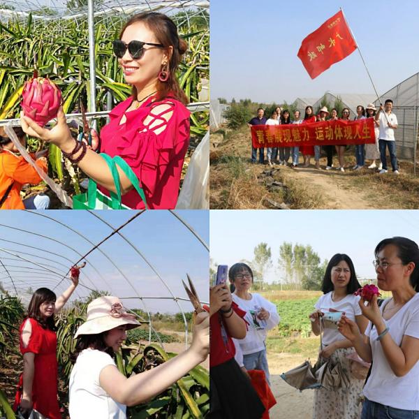 秋高氣爽的季節(jié),秋老虎有恃無恐,照在臉上火辣辣的,大家依然興致勃勃。到了田間地頭,一群成年人竟變成了好奇開心的小學生,連環(huán)炮的向農(nóng)場主發(fā)問:“火龍果竟長在這帶刺的植株上,是不是仙人掌科呀?”“什么樣的火龍果才是肉多汁甜呀?”“植株上這么多刺,怎樣采摘不受傷呀?”沒等農(nóng)場主一一解釋清楚,大家忍不住躍躍欲試了。有的空手赤拳,直接去擰;有的戴上手套,有備而來;有的兩人搭檔,一人頂著果實,一人剪切……大家三個一群,兩個一伙,摘著果實,聊著天,話著家常,拍著照片,發(fā)著抖音,忙得不亦樂乎。火龍果植株上的刺刺傷了手,劃傷了臉,沾到了衣服,大家也渾然不覺,回到大自然的懷抱,大家率性的開啟著生命的本真,盡情釋放著工作中的壓力,享受著生活中最簡單最原始最愜意的快樂。