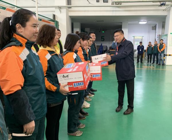 隨后,谷德凱常務副主席一行前往基層慰問一線職工。每到一處,谷主席都為一線員工送去方便面、火腿腸、水果等慰問品,并與職工親切交談,詳細了解業務發展情況,詢問“雙11”期間投遞量的變化、一線職工收入情況等,實地查看了生產作業場地、職工書屋、職工活動室、職工食堂、職工小家、創新工作室等。在太原國際郵件互換局和太原郵區中心局,谷主席對大家積極應對“雙11”,全力以赴保時限、保質量、保服務給予充分肯定。他指出,“雙11”是創收旺季,一定要注意郵件安全,確保質量和時限,踐行好“人民郵政為人民”的服務宗旨,努力打造行業“國家隊”。在看到現場忙碌的工作場景后,他叮囑大家在工作的同時要保護好身體,注意勞逸結合。在朱迎春創新工作室,谷主席認真聽取了創新工作室情況,詳細了解了推出的創新成果,表示肯定和贊許。特別是對“郵政半掛車廂制動系統加裝低氣壓報警裝置”給予高度評價,并現場對如何改進集包封裝,提高生產效率、減少職工重復勞動提出建議。他要求創新工作室要起到示范引領和輻射帶動作用,從工作實際出發優化工藝流程,特別是在小機具方面有一些革新,不斷提高生產效率,充分發揮創新工作室破解工作難題、推動企業創新發展的作用。