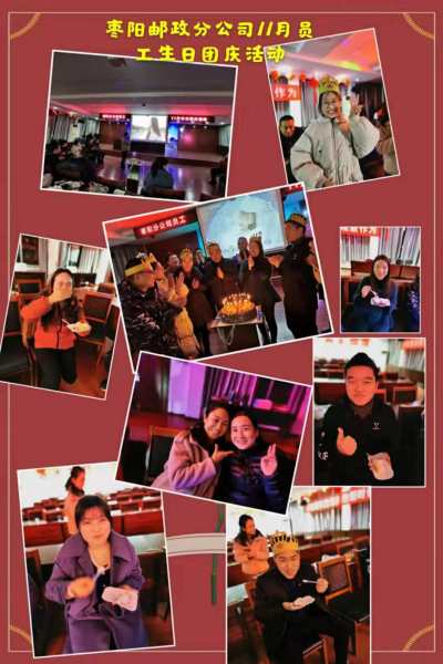 11月27日晚,棗陽郵政分公司為豐富員工業余生活,增強團隊凝聚力,營造和諧團隊的文化氛圍,由工會組織的首場以“和諧、感恩、友愛、進步”為主題的團建活動暨員工生日會在公司四樓會議室舉行。