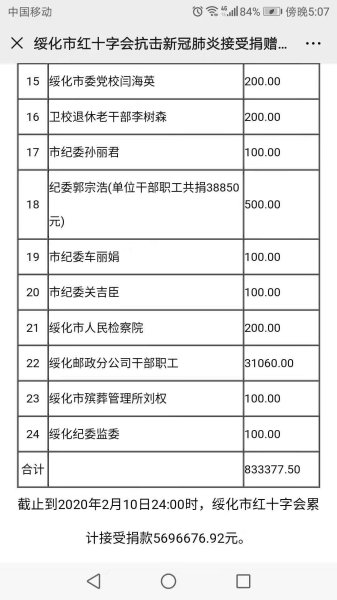 自武漢新冠疫情爆發以來,牽動著14億中國人民的心。綏化市郵政分公司黨委高度重視,時刻關注疫情發展。在當前疫情防控的關鍵時期,為應對新冠疫情,大力弘揚“人道、博愛、奉獻”精神,2月9日上午10時,綏化郵政專門以網絡會議的方式召開了總經理辦公會議,要求全公司干部職工統一思想和行動,為“戰斗”在一線的所有工作人員進行愛心捐款。綏化郵政工會迅速行動,發出疫情防控專項募捐倡議。公司領導班子紛紛獻出自己的愛心帶頭捐款,全體干部職工積極響應。從中午11時至下午17時,僅用了短短6個小時的時間,共有380名干部職工獻出愛心,籌集善款達3.1萬元。目前全部善款已匯至綏化市紅十字會賬戶,用以支持一線戰“疫”。