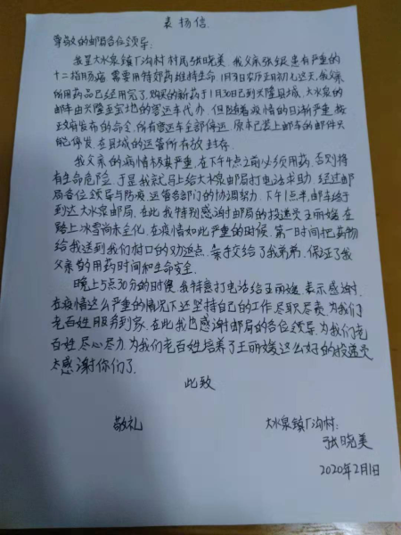 病疫無情人有情。1月31日上午10時25分,承德興隆縣郵政公司大水泉支局接到大水泉鄉廠溝村村民張曉美的求助電話,其父因患有嚴重的十二指腸癌,今天下午4點前必須服用采購的一批特效藥,否則就會有生命危險。而購藥郵件已于1月30日到達興隆縣城,大水泉郵路由興隆至寶地客運車代運,由于疫情形勢嚴峻,全縣所有客運營運車輛全部停運,原本已裝上郵車的郵件只得暫留在縣城運管所集中保管。求助就是命令。大水泉支局長程躍接到電話后,立即向興隆縣分公司領導匯報,縣分公司領導隨即向縣新型冠狀病毒感染肺炎疫情領導小組進行求助,與交通局溝通協調放車事宜,并安排網運調度員通知客運車輛司機在運管所待命,便于在放車的第一時間將藥物緊急運輸到大水泉支局,同時,安排一輛郵政車輛在運管所待命,如果協商不成,則專車運輸,大水泉郵政支局做好接車及郵件投遞相關準備工作。經過多次溝通協調,下午13時35分,代運郵件客車準時到達大水泉支局。郵件一到,女投遞員王麗媛立即騎上摩托車向與客戶約定好的接收地點出發。當時第二場冬雪尚未融化,沿途路面有結冰現象,十分危險。王麗媛毫無畏懼,因為她的心中只有一個念頭,一定要在下午4點之前讓客戶拿到特效藥。下午15時20分,王麗媛在約定地點將郵件遞交到客戶手中,晚上17時30分,王麗媛接到了張曉美的感謝電話,稱其父用藥后已脫離危險。這是一次與時間賽跑的投遞,這是一次與死神爭取時間的投遞,疫情面前,承德市興隆縣郵政分公司用實際行動堅守初心與使命,堅決履行央企政治責任、社會責任。
