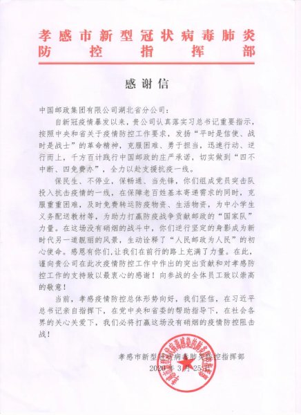 3月25日,湖北省分公司收到了來自孝感市新型冠狀病毒肺炎防控指揮部發來的感謝信。信中對湖北郵政發揚“平時是信使、戰時是戰士”的革命精神,秉承“人民郵政為人民”的初心使命,迅速行動、逆行而上,千方百計踐行中國郵政的莊嚴承諾,切實做到“四不中斷、四免費辦”,全力以赴支援抗疫一線的做法表示高度肯定和衷心感謝。