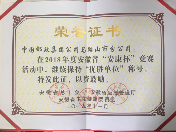 4月20日下午,市總工會(huì)召開(kāi)全市工會(huì)十二屆十二次全體(擴(kuò)大)會(huì)議,會(huì)上馬鞍山市郵政市分公司受到表彰,榮獲“2018年度安徽省安康杯競(jìng)賽優(yōu)勝單位”稱號(hào)。 安徽省“安康杯”競(jìng)賽是在省委、省政府的堅(jiān)強(qiáng)領(lǐng)導(dǎo)下,按照中華全國(guó)總工會(huì)和國(guó)家安全生產(chǎn)監(jiān)督管理總局的統(tǒng)一部署,全省企事業(yè)單位積極參與,以“廣泛發(fā)動(dòng)提質(zhì)量,文化引領(lǐng)強(qiáng)基礎(chǔ)”為主題的“安康杯”競(jìng)賽活動(dòng),是安全生產(chǎn)最高榮譽(yù)獎(jiǎng)牌。