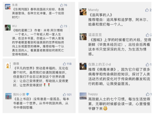 今年由于新冠肺炎疫情影響,分行工會將傳統(tǒng)的現(xiàn)場讀書分享會改為網(wǎng)絡(luò)讀書分享的形式,以“好書推薦”為載體,通過“網(wǎng)絡(luò)宣傳”、“在線推薦”等方式召集各方書友,開啟了“讀書周”活動,活動一經(jīng)推出,得到了廣大書友的積極參與,他們紛紛拿出各自“壓箱底”的好書進行分享,令人受益良多,正如他們所說的:“當(dāng)我還是孩子時,我吃過很多食物,現(xiàn)在已經(jīng)記不起吃過什么了。但可以肯定的是,它們中的一部分已經(jīng)長成了我的骨頭和肉。讀書對人的改變也是如此。”