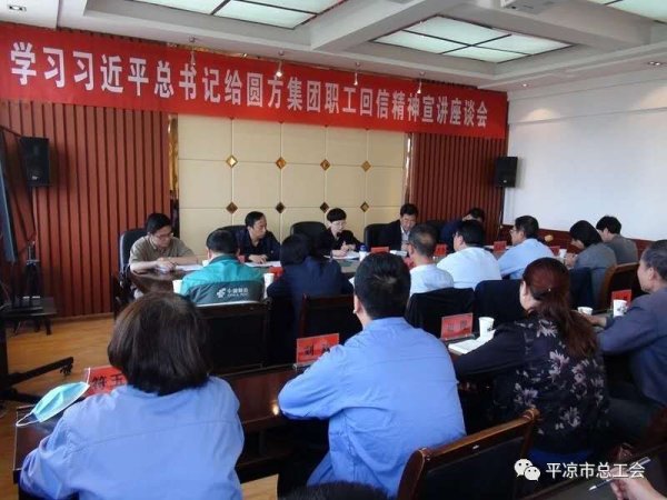 5月22日,甘肅平涼市總工會召開學習習總書記給鄭州圓方集團職工回信精神宣講座談會,省、市工會相關領導和全市部分行業勞動者代表,共同學習習總書記回信精神,來自不同行業的勞動者暢談自己的學習感想和體會。