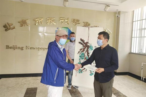 5月13日,一輛銀灰色的汽車緩緩駛入北京市報刊零售公司停車場,一位老人拿著布口袋在同事的陪同下向大門走去。發行局副局長王波、零售業務室主任王靖趕緊走下臺階迎接老人,與老人握手致意。“這是我的一點心意,感謝綠衣人不畏疫情、風雨無阻地為百姓服務,你們和白衣天使一樣值得大家崇敬。”話音未落,老人將一幅畫卷展開,一株麗質芳姿的綠色梅花映入大家的眼簾,畫上還寫著一行字:“與民一滴水,民報予涌泉。”