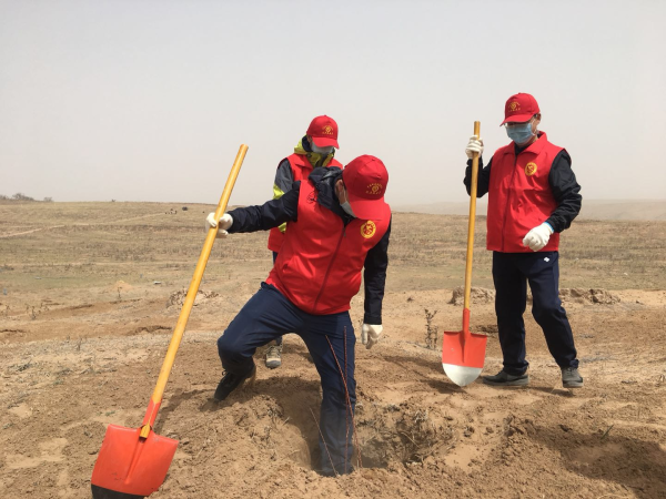 當(dāng)天,植樹現(xiàn)場一派熱火朝天的勞動景象。分行員工熱情洋溢,個個干勁十足。在林場工作人員的指導(dǎo)下,大家分工合作,有的揮鋤挖土,有的扶苗填坑,有的揮鍬培土,有的夯實土層,每一個環(huán)節(jié)、每一個動作都一絲不茍,甘肅郵儲八步沙林場春季植樹造林活動的美好畫卷在這里徐徐展開。經(jīng)過一個上午的忙碌,400余株榆樹、紅柳、梭梭扎根沃土,在風(fēng)中昂然挺立,為林場增添了一片新綠。