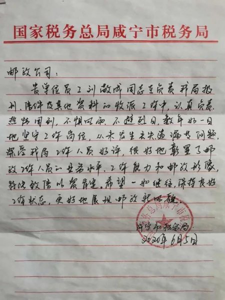 “劉敬成同志認真負責、熱情周到、不懼風雨、不避烈日,數(shù)年如一日地堅守工作崗位,從未發(fā)生丟失、遺漏等問題,深受我局工作人員好評……”近日,咸寧市郵政分公司收到一封來自咸寧市稅務(wù)局手寫的表揚信,信中高度贊揚該分公司溫泉城區(qū)投遞站投遞員劉敬成在日常工作中認真熱情,無丟失、無遺漏,默默堅守崗位的精神風貌。劉敬成究竟做了什么,能得到客戶如此肯定?