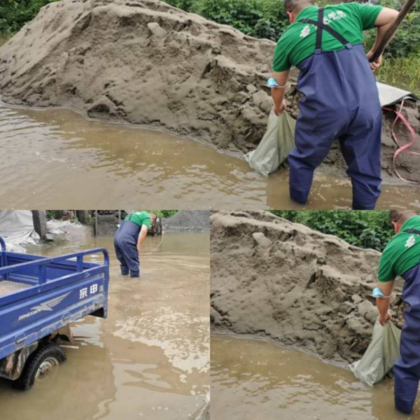 岑河支局在購買不到沙袋的情況下,自己動手、豐衣足食。支局經理龔偉聯系到一家沙廠,岑河支局防汛突擊隊連忙來到沙廠,帶上鐵揪,將采購的一批蛇皮袋全部裝滿沙子,這批沙袋順利運回支局備用。