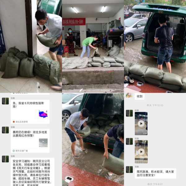區分公司防訊辦在安全工作微信群、QQ群持續播報漬水路況、天氣預警、暴雨提示信息,提醒員工時刻關注雨情,提前做好防范;加強對地勢低洼營業網點、投遞站等場地、房屋滯水情況的排查,及時堆碼沙袋。