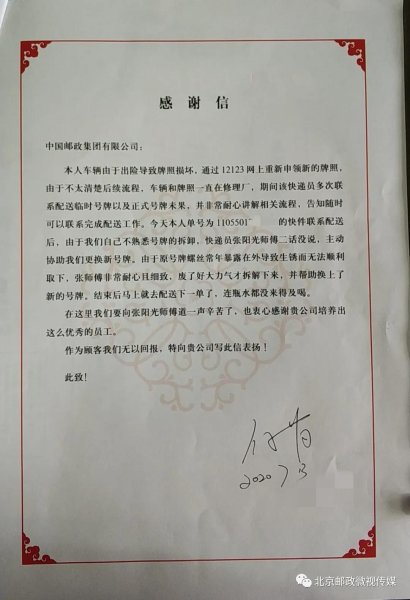 近日,市公司收到了一封感謝信。寫信人白先生細致的講述了通過12123網上重新申領新牌照及更換新牌照過程中,同城業務分公司員工張陽光對他的幫助。信中,他對耐心細致的投遞員張陽光表示感謝,并衷心感謝公司培養出這么優秀的員工。