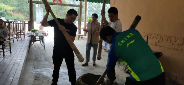 根據(jù)行程安排,下午2點半,大家開始了傳統(tǒng)民俗文化活動——打糍粑。會做的小伙伴們,齊心協(xié)力打糍粑、烙糍粑,現(xiàn)場其樂融融,笑聲不斷。