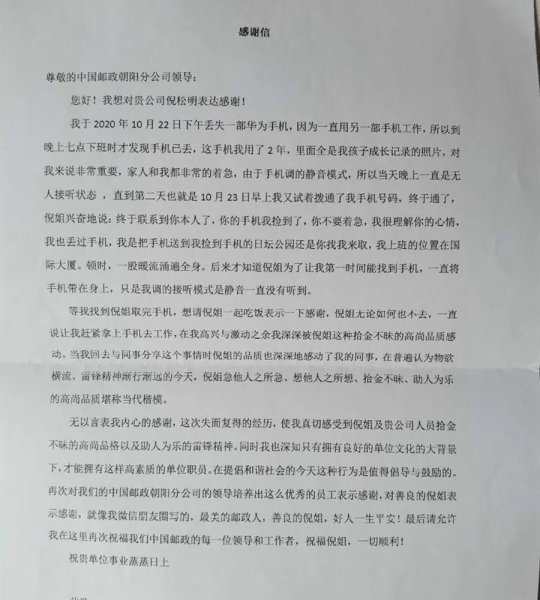 第一封信來自用戶溫顏紅女士,這封感謝信背后有一個拾金不昧、助人為樂的故事。溫顏紅女士于10月22日不慎將手機丟失后,內心十分焦急,因為手機里存儲著記錄孩子成長的照片,這些照片對她來說十分重要。由于手機被設置為靜音模式,當天晚上溫女士一直無法撥通,直到第二天晚上才有人接聽。“終于聯系到您了,手機我揀到了,不要著急,我很理解您的心情,我們約在您丟手機的日壇公園見面吧。”掛斷電話,溫女士覺得一股暖流涌遍全身。 后來,溫女士得知是朝陽區呼家樓郵政支局的員工倪松明拾金不昧,便想請他吃飯。但為了不影響工作,倪松明婉言謝絕了她的邀請。因此,溫女士最終選擇用一封信表達對倪松明的感謝。她在感謝信中說:“這次失而復得的經歷,使我真切感受到了郵政企業員工拾金不昧的高尚品格、助人為樂的雷鋒精神。在此,再一次向對朝陽郵政培養出的優秀的員工表示感謝。”