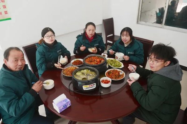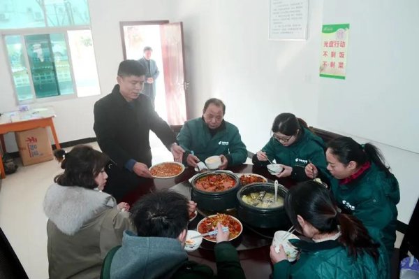 看到大家拼命工作的狀態,作為支局經理,項順成認為必須為員工做點什么。在項順成的提議下,福田支局旺季生產期間每月給小食堂增加500元補貼,讓辛苦了一天的員工晚上能“加雞腿”。在湖北,一進臘月,臘魚臘肉就是家家戶戶餐桌上必不可少的一道菜,支局小食堂也為員工安排上了。熱氣騰騰的黃顙魚火鍋、鴨子燒胡蘿卜,湖區特色的鲊辣椒糊小魚,還有蒸臘魚、時令蔬菜、雞蛋湯……小食堂的豐盛午餐,讓員工們有了家的感覺。