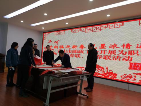 歡歡喜喜送春聯,熱熱鬧鬧過春節。2月7日下午,黃山市郵政工會在市分公司六樓多功能廳開展“金牛納福迎新春 筆墨濃情送祝福”寫春聯送春聯活動,市郵政工會邀請市著名書法家姬臣為廣大員工納“福”字、寫春聯。