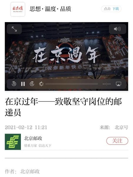 多渠道齊發力。春節期間,北京郵政推出特別策劃短片,聚焦“留京過年” 講述北京郵政投遞員留京過年,堅守崗位的動人故事——《每一份快遞年貨的背后都有他們的默默堅守》。短片生動詮釋了北京郵政人響應國家號召在京過年、堅守崗位的故事,贏得廣泛關注,取得了良好的宣傳效果。短片在新華社客戶端、北京日報客戶端、 中國郵政報微信平臺、騰訊網、鳳凰網、 好看視頻、芒果TV、網易視頻、京郵宣傳中心視頻號等多渠道、多平臺同步播出。截至22日,據不完全統計, 合計瀏覽量超過80萬次。