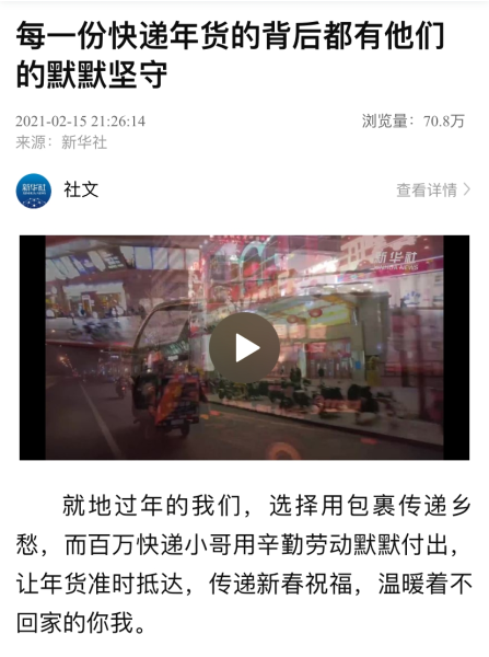 春節期間,北京郵政繼續堅持“春節不打烊”的傳統,為原地過年的人群做好寄遞服務。無數快遞小哥的新春堅守,產生了很多動人心弦的故事。為了更好地講好北京郵政故事,北京郵政新聞中心、北京郵政工會拓寬宣傳渠道、多點開花,做好春節期間宣傳報道工作。