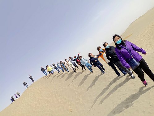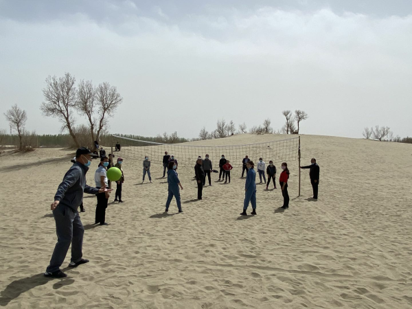 上午11時,和田地區分公司45名員工驅車前往和田市沙漠觀景點。此活動分為三個部分進行,第一部分是沙漠徒步,第二部分是沙灘排球比賽,第三部分是沙漠拔河比賽。大家在歡笑中,深入沙漠,歡聚在沙丘上。