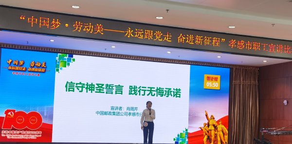 5月8日上午,在孝感市總工會組織舉辦的“中國夢·勞動美--永遠跟黨走 奮進新征程”孝感市職工宣講比賽決賽中,來自孝南區郵政分公司的職工肖周芹榮獲三等獎。