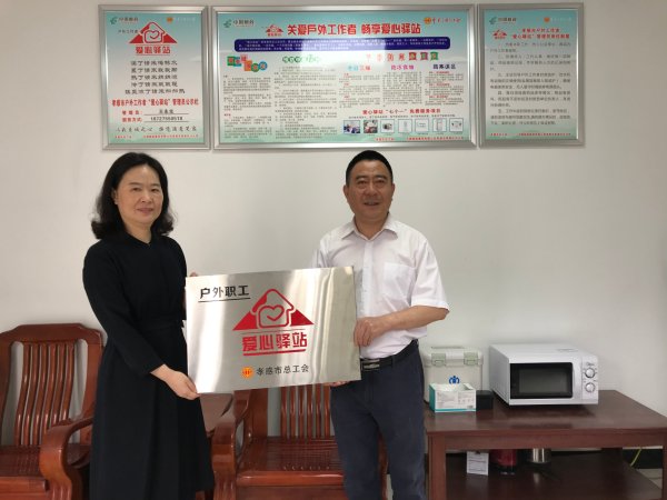 5月28日上午,孝感市總工會副調研員萬纓來到孝南區車站郵政支局為新建成的“愛心驛站”授牌。