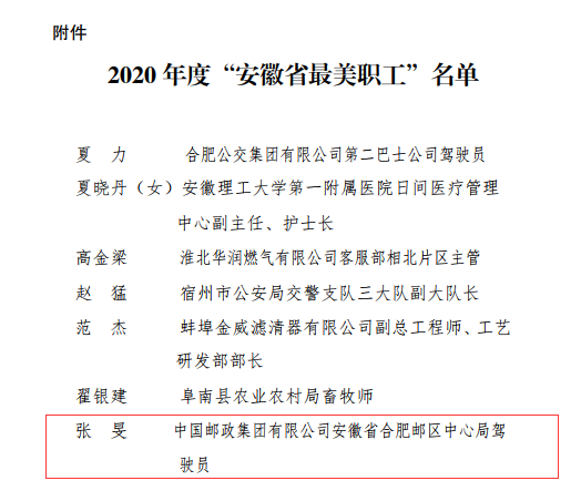 近日,安徽省委宣傳部、安徽省總工會聯(lián)合下文,合肥郵區(qū)中心局郵件運(yùn)輸中心張旻同志榮獲“2020 年度安徽省“最美職工” 稱號。
