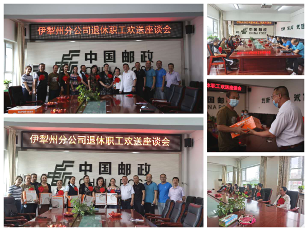 2021年6月11日下午,一場簡單而溫馨的伊犁州分公司退休職工歡送座談會在三樓會議室舉行,州分公司黨委書記、總經理張衛江,紀檢書記、副總經理郭新全和工會副主席黃建軍與退休職工及所在部門的負責人歡聚一堂,熱烈歡送11名光榮退休的郵政職工。