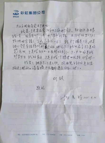 老人對劉曉紅同志多年來 “急用戶之所急,用心用情為客戶服務” 以實際行動踐行“人民郵政為人民”初心使命的工作態度特提出感謝和表揚(北京郵政工會)