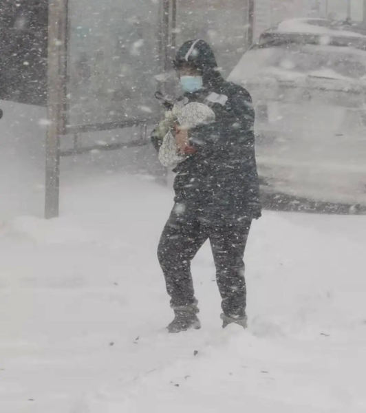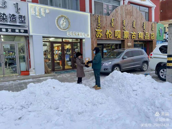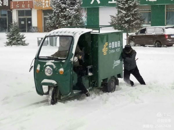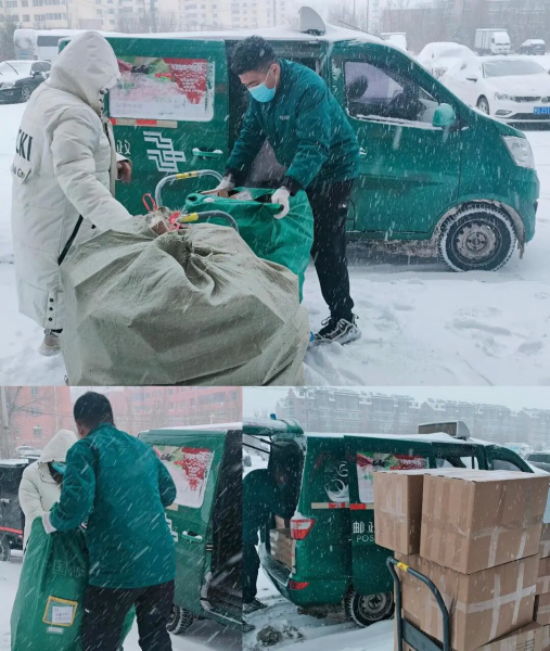 雖然郵路、道段被冰雪覆蓋,車輛難以通行。但在這紛飛飄揚的雪花中,有了“娘家人”的溫暖,隨處可見那抹“郵政綠”。他們堅守崗位,不畏嚴寒,步履匆匆逆雪而行穿梭于大街小巷、奔波于商家客戶的身影,他們滿載客戶期待,從心出發,盡最大努力將每一封郵件、每一份報紙、每一件包裹及時送到用戶手中的畫面勾勒出了一幅幅“人民郵政為人民”的感人畫卷。