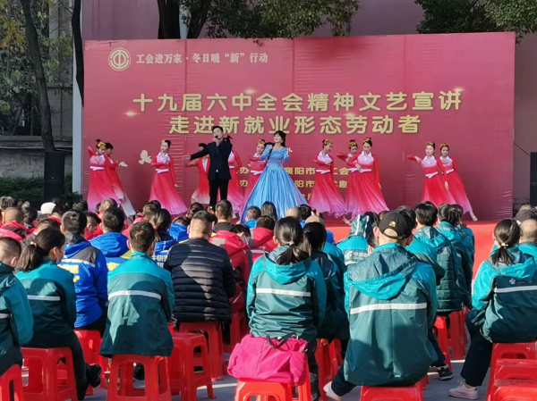12月22日下午,襄陽(yáng)市總工會(huì)“工會(huì)進(jìn)萬(wàn)家,冬季暖新”行動(dòng)十九屆六中全會(huì)精神文藝宣講走進(jìn)新就業(yè)形態(tài)勞動(dòng)者文藝演出在市郵政分公司隆重舉辦,會(huì)場(chǎng)邀請(qǐng)了全市各快遞行業(yè)投遞人員、新服務(wù)行業(yè)人員觀看演出,使用文藝+的形式將黨的十九屆六中全會(huì)精神送至基層。現(xiàn)場(chǎng)100多名新就業(yè)形態(tài)勞動(dòng)者在觀看文藝節(jié)目,會(huì)場(chǎng)還穿插了全會(huì)精神問(wèn)答環(huán)節(jié),現(xiàn)場(chǎng)觀眾積極搶答。