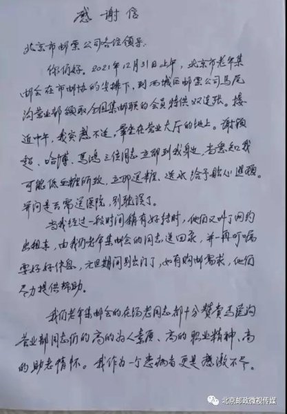 在剛剛過去的元旦假期里,北京市郵政分公司文傳部收到了一位來自北京市老年集郵協會石遐識老先生寫來的感謝信。感謝西城區馬尾溝郵政支局伸援手搶救暈倒老人,對馬尾溝支局干部員工“高素質、高敬業精神、高助老情懷”給予高度肯定。